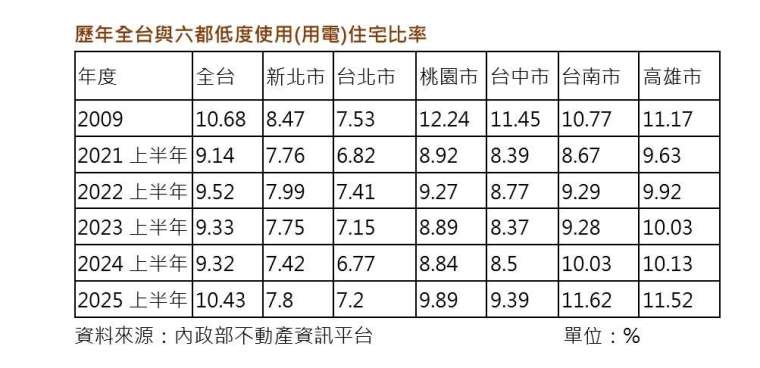 统计显示,全台低度使用 (用电) 住宅比率,以整体长期趋势观察,2009 年低度使用住宅比率 10.68%,为统计以来的相对高点,之后呈下降趋势,2021 年下半年达到长期低点的 8.66%,之后开始缓步上升。2025 年上半年低度使用住宅比率 10.43%,为统计以来的次高点。