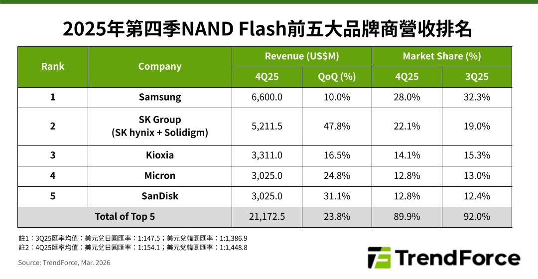 AI 伺服器储存需求暴增,4Q25 NAND Flash 前五大品牌厂营收季增