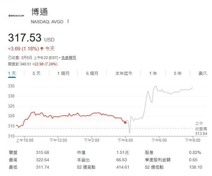 截稿前,博通 (AVGO-US) 周四盘前股价上涨 7.24%,每股暂报 340.51 美元。