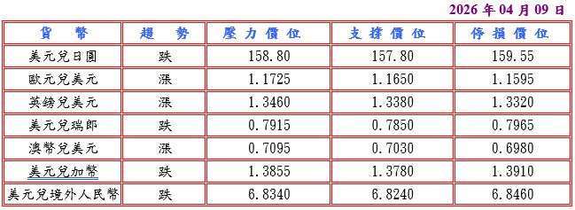 据白宫发言人莱维特表示,各方正就伊朗问题面对面会谈进行讨论,但美国总统川普或白宫正式宣布之前,一切尚未最终确定,而且市场关注焦点转向各国央行的下一步行动,目前预期美国联邦準备理事会 (FED) 年底前降息的概率升至 50%,重创美元兑日圆至一个月低点 157.86。随着旧金山联邦储备银行总裁戴利称,儘管伊朗战争导致油价大幅上涨及战争将持续多久尚不明朗,但美国经济的基本面仍然良好,而且根据 FED 的 3 月会议纪录显示,越来越多政策制定者认为必要时可能需要加息,扶助美元兑日圆收复部分失地。预估今日美元兑日圆阻力于 158.80-159.00,支撑于 157.60-80。