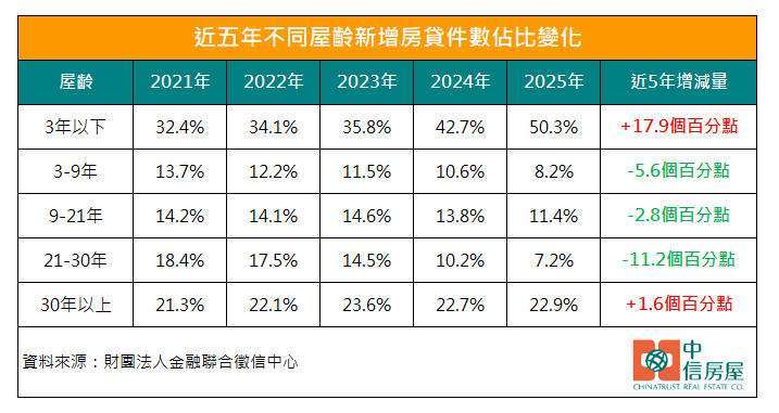 在近两年的全台交屋潮涌现之下,3 年以下的新成房贷申领节节攀高,房仲业者彙整财团法人金融联合徵信中心资料发现,近五年新增房贷件数的屋龄分布出现了明显的结构性变化,其中,屋龄 3 年以下新成屋申贷占比自 2021 年的 32.4%,攀升至 2025 年的 50.3%,五年大增 17.9 个百分点,创下历史新高。