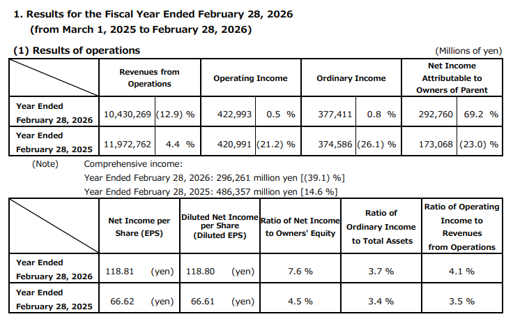 Seven & i 9日公布上年度(2025年度、2025年3月-2026年2月)财报:合併营收年减12.9%至10兆4,302亿日圆,合併营益年增0.5%至4,229亿日圆,合併纯益暴增69.2%至2,927亿日圆、纯益创下历史新高纪录。