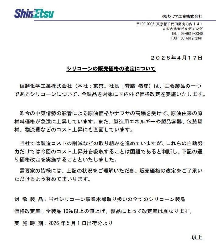 近期半导体涨价的风潮,终于也延伸到材料上面!根据最新消息,日本化学材料大厂信越化学工业株式会社在日前正式地发布声明表示,预计将针对其主力产品之一的硅利光(Silicone,有机硅)实施国内外全面性的价格调涨。此次全线产品的调幅高达 10% 以上,新售价预计自 2026 年 5 月 1 日出货起正式生效。