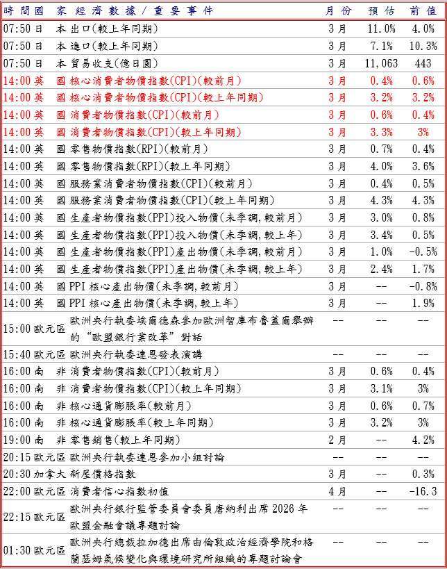 据德国经济研究机构 ZEW 公布德国 4 月经济景气指数下降至负 17.2,降幅远高于预期,突显企业感受到中东战争带来的经济影响远不止于物价上涨,另外欧洲央行 (ECB) 副总裁德金多斯表示,鑒于伊朗战争带来的巨大不确定性,ECB 在制定利率时必须保持谨慎,推低欧元兑美元下滑至 1.1718 低点。预估今日欧元兑美元阻力于 1.1760-80,支撑于 1.1690-1.1710。