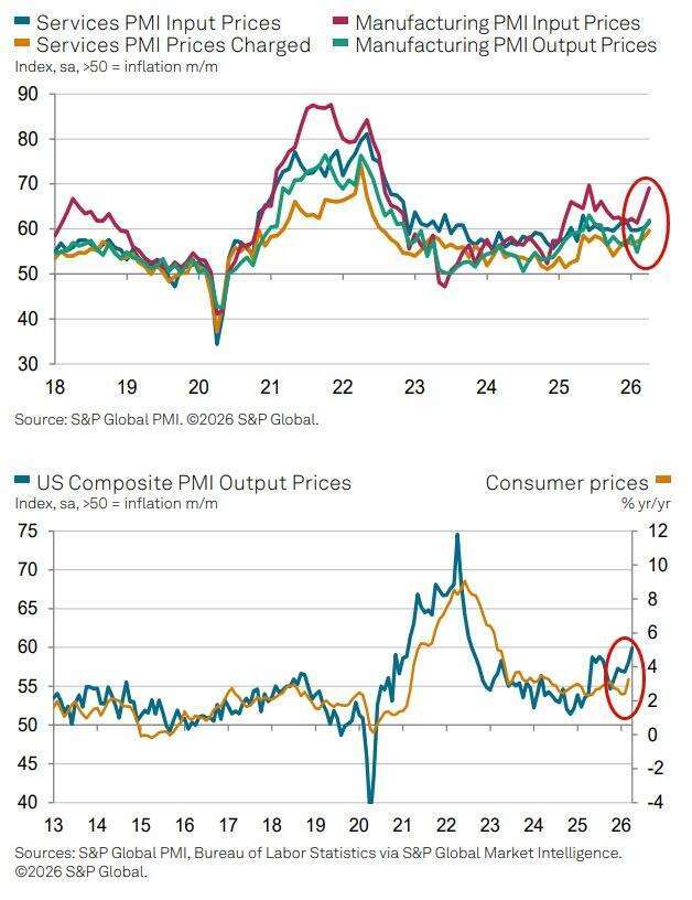 分析指出,企业正迅速将成本转嫁至终端价格,使通膨压力从能源扩散至更广泛的商品与服务领域。标普全球首席经济学家威廉森 (Chris Williamson) 表示,目前整体通膨情势已达近四年来最令人担忧的水準,若此趋势延续,将使联準会 (Fed) 更难推动降息。