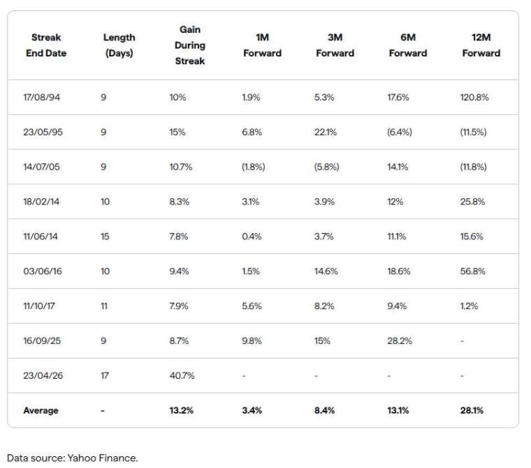 历史数据预示:涨势或许尚未到头面对如此快速且剧烈的涨幅,投资人最担心的莫过于市场是否已经过热。然而,历史数据给出了相对乐观的答案。分析过去 8 次连涨 9 天以上的案例后发现,这种长红趋势往往是动能累积的讯号,而非市场枯竭的徵兆。